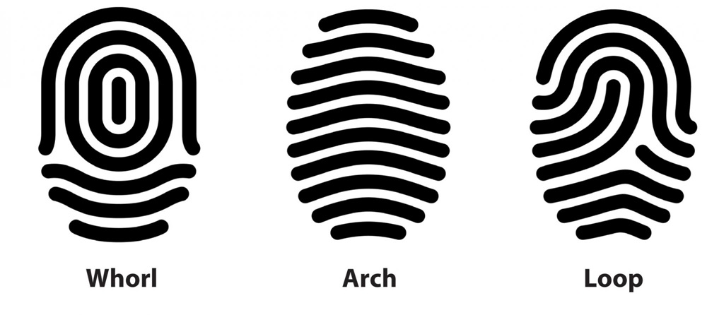 Dấu vân tay có 3 loại: hình cái lều (arch), đường cong (loop) và vòng xoáy hay còn gọi là hoa tay (whorl).