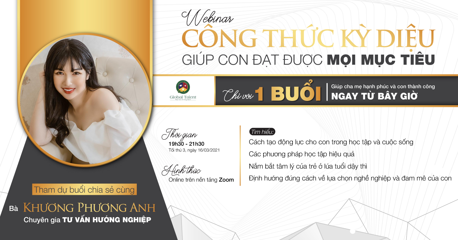 Thấu hiểu niềm băn khoăn của bậc cha mẹ, Global Talent tổ chức buổi Webinar "CÔNG THỨC KỲ DIỆU GIÚP CON ĐẠT ĐƯỢC MỌI MỤC TIÊU" nhằm cung cấp thông tin cũng như chia sẻ những kinh nghiệm và tư vấn những phương pháp giáo dục con tốt nhất tới các bậc phụ huynh.